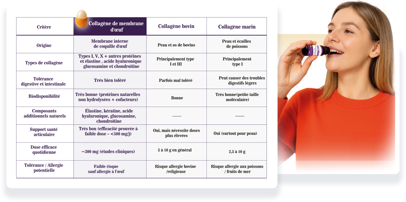 source de collagène naturel(protéine type I, V et X),acide hyaluronique, glucosamine, chondroïtine et autre.