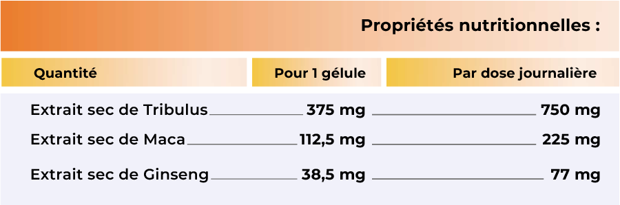 Contient des saponines stéroïdiennes, connues pour stimuler la sécrétion naturelle de testostérone et favoriser la libido, avec une amélioration des performances sexuelles et de la force musculaire.